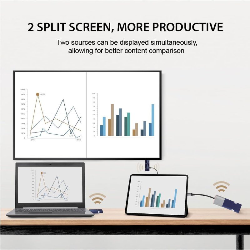 CastGo is a versatile and easy-to-use device that allows you to cast your mobile devices to your TV, monitor, or projector with ease. It features a Convertible HDMI to type C adapter, which means you can connect devices with both HDMI and type C ports. With up to 2 split screens, you can multitask and enjoy your favorite content on the big screen. The device also supports native display protocols such as AirPlay, Miracast, and Google Cast, making it compatible with a wide range of devices. Whether you're watching movies, playing games, or sharing photos, Nimble CastGo has you covered. It's small and portable design makes it perfect for travel, and its intuitive controls make it easy to use.