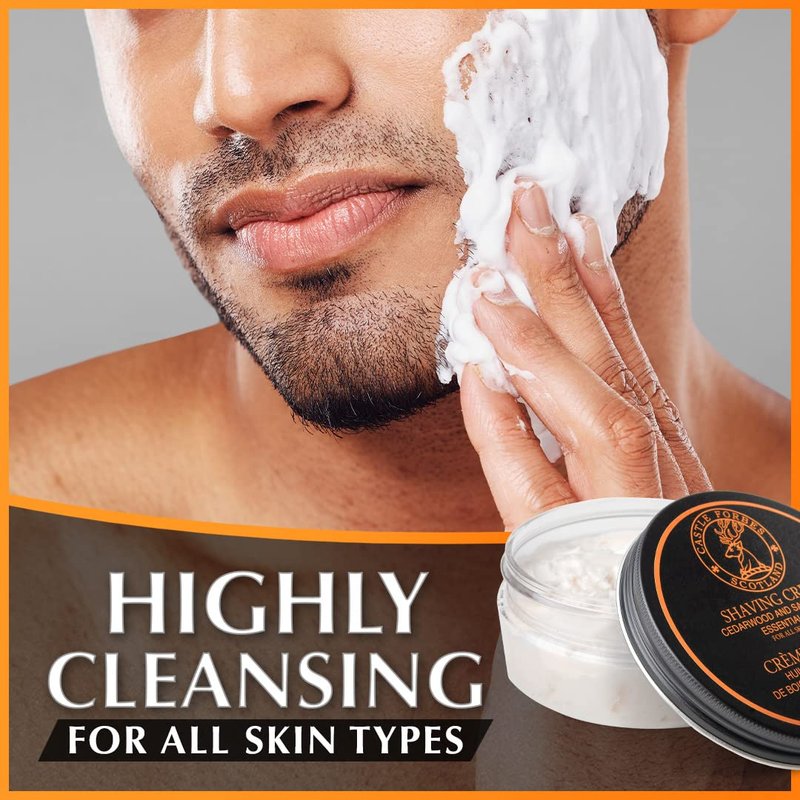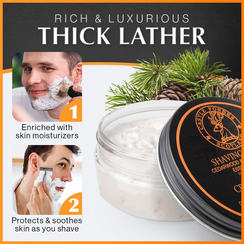 - THE FINEST SHAVING EXPERIENCE - Castle Forbes Essential Oil Shaving Cream creates a luxurious and sophisticated shaving experience that will elevate your grooming routine. Its rich, creamy lather protects and nourishes the skin, to help reduce irritation and provide a close and comfortable shave while moisturizing the skin. Best of all only a small amount of Castle Forbes beard shaving cream creates a thick, cushioning lather that soothes as you shave– so one tub can last for months!