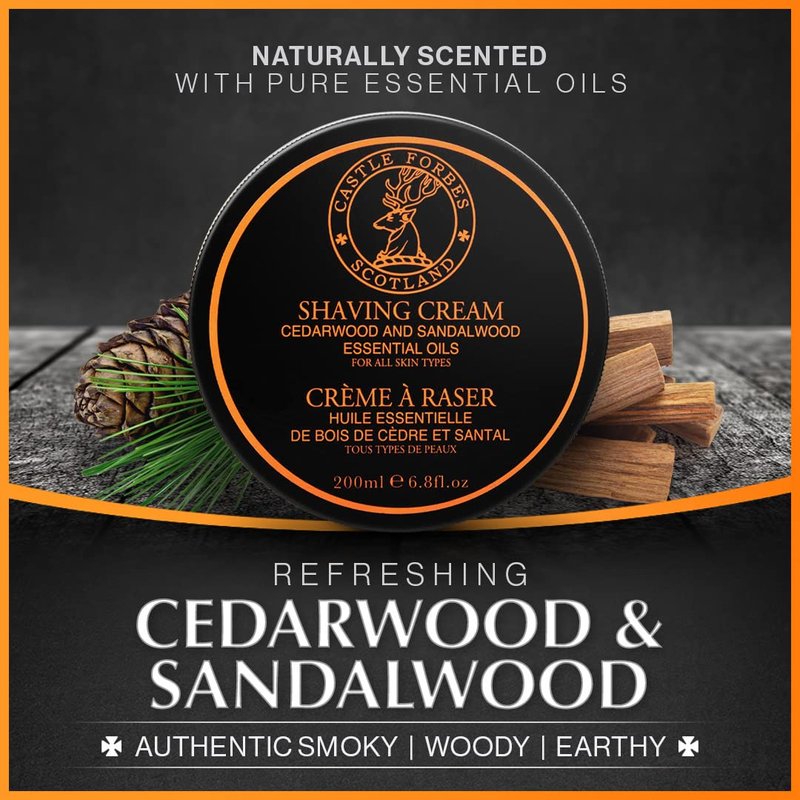 - AUTHENTIC, INVIGORATING SCENT - This unique and rich blend of cedar and sandalwood shave cream is made with essential oils for a refreshing, invigorating scent that will awaken your senses and leave you feeling revitalized. The natural essential oils are not only pleasing to the nose, but they also have skin-beneficial properties that are highly cleansing and nourishing, and offer added skin protection.