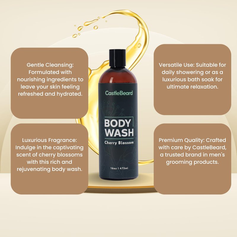 Indulge in the heavenly scent of cherry blossoms with CastleBeard's Body Wash. This luxurious 16 oz (473 ml) bottle offers a refreshing cleansing experience, leaving your skin feeling clean and invigorated. The rich, fragrant lather gently cleanses without stripping away your skin's natural oils, ensuring a comfortable and nourishing wash. Embrace the delicate floral aroma that will transport you to a serene garden with every use. Elevate your shower routine with this exceptional body wash from CastleBeard.