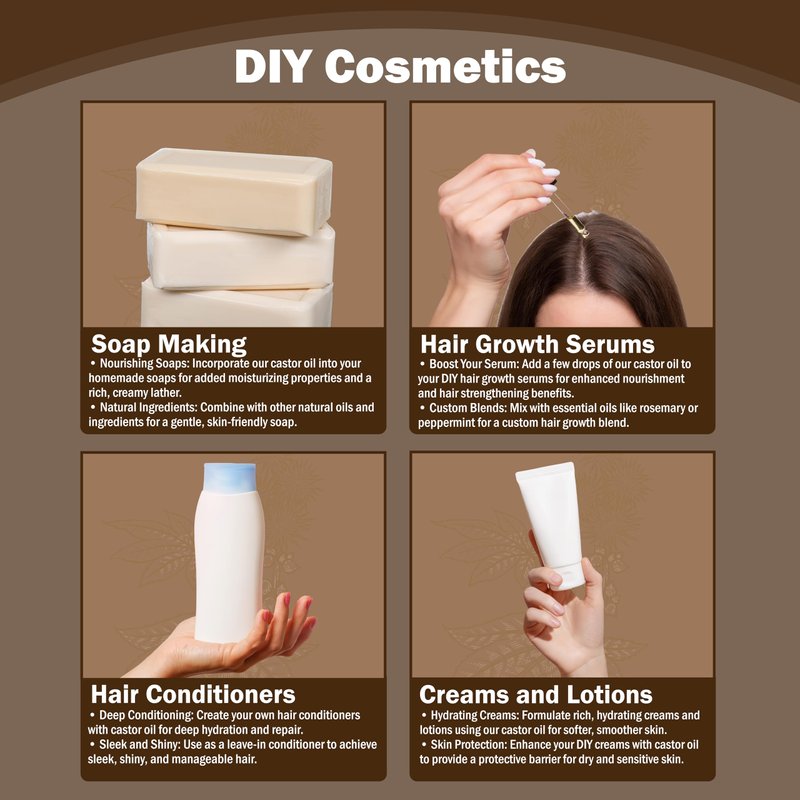 Castor oil is a versatile oil known for its benefits on the skin and hair. It deeply moisturizes the skin, reducing wrinkles and leaving it soft and radiant. For hair growth, it strengthens follicles and stimulates growth, resulting in thicker, healthier hair. Its natural properties make it a popular choice for skincare and hair care needs, providing nourishment and promoting overall well-being. In addition to its moisturizing properties, castor oil also helps soothe and calm irritated skin, making it a gentle option for sensitive skin types. Furthermore, its ability to combat dryness and address scalp issues like dandruff makes it a valuable addition to your beauty routine.
