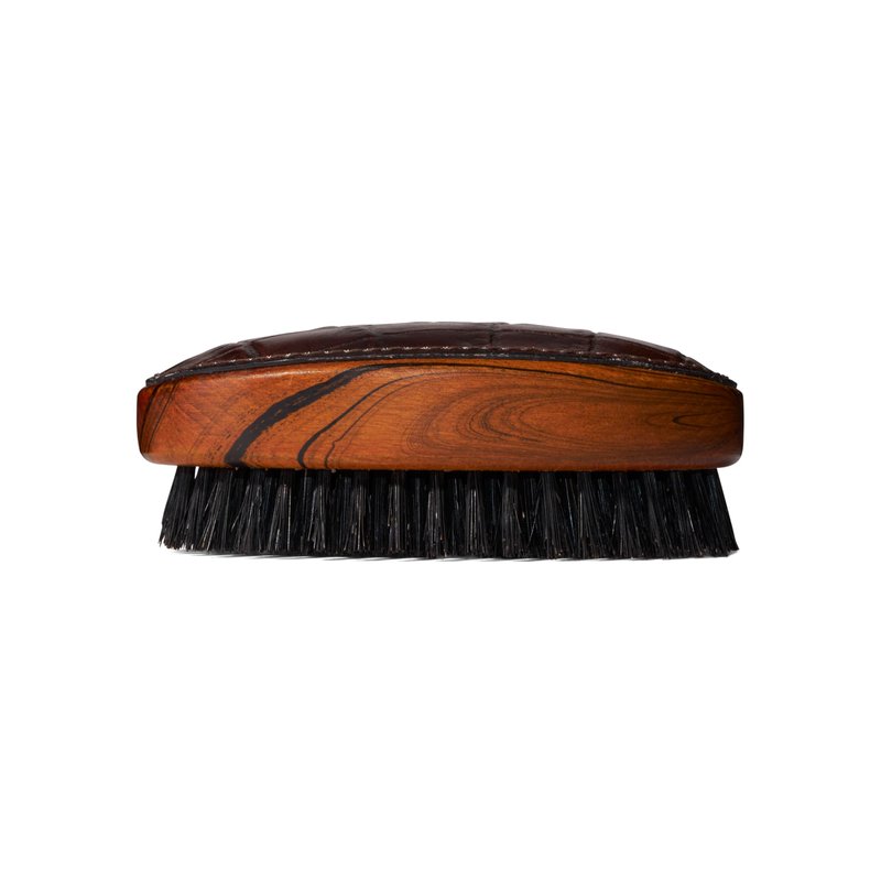This medium-bristled military hairbrush is handmade to the most exacting standards of craftsmanship with boar bristles. Accented with a leather top, this hairbrush is perfectly weighted and very comfortable in the hand. Ideal for men with short hairstyles it massages the scalp on every use. This hairbrush can also be used on longer, more stiff beards.