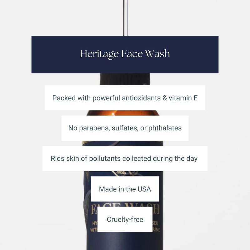 - Deeply Moisturizing: With a glycerin base, the Heritage Face Wash provides a deep cleanse without over-drying skin, making it the ideal cleanser to keep at hand for regular morning and evening use.
