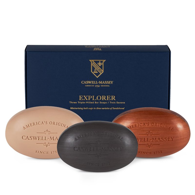 Caswell-Massey Triple Milled Sandalwood Explorer Three-Soap Set, Woodgrain, Sandalwood & Tricorn Soap Bars, Natural Bar Soap for Men, Moisturizing Men’s Body & Face Soap, 164g Bars (3 Soap Set)