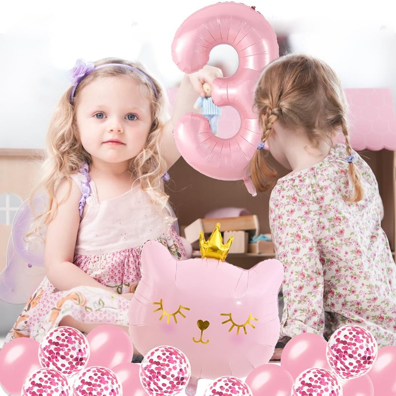 - Cat Party Decorations Set: 1PCS number 3 balloon 40 inch, 1PCS large cat balloons 27*22.5inch, 4PCS pink balloons, 4PCS pink confetti balloons 12 inch.