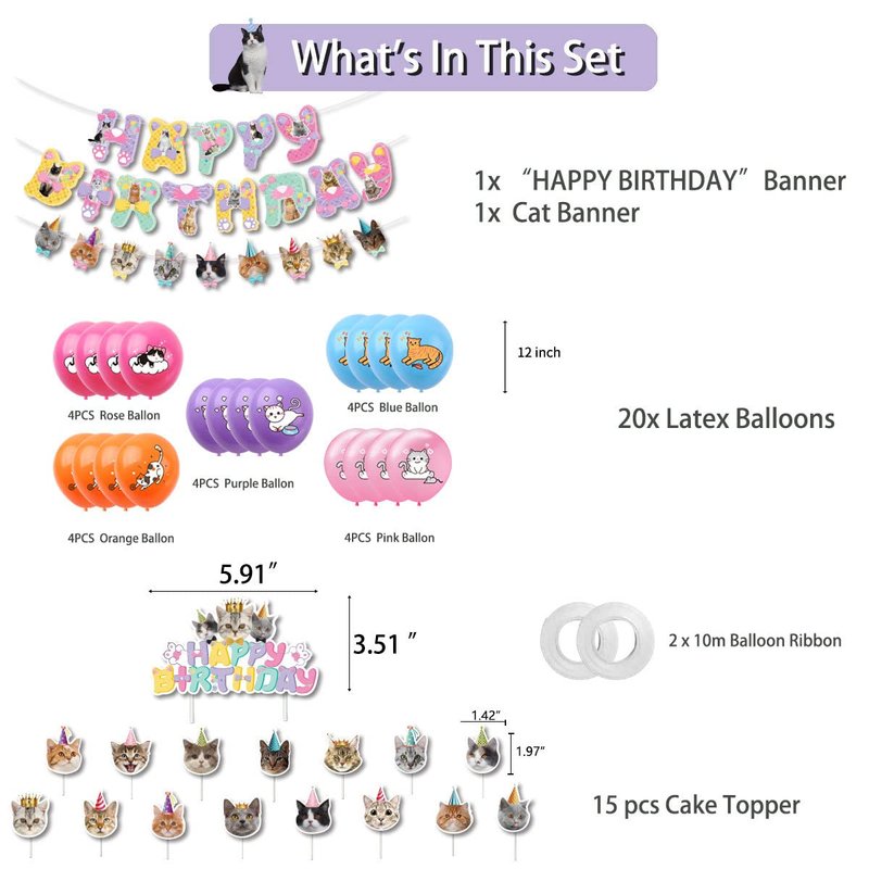 - 1.VALUE PACK: Cat themed birthday party set with 40 pieces, including 2 cat pattern birthday banners, 20 latex balloons, 2 flat ribbons, 15 cake decorations and 1 large cake decoration. This is a perfect decoration gift, when the decoration is finished, please enjoy your birthday party!
