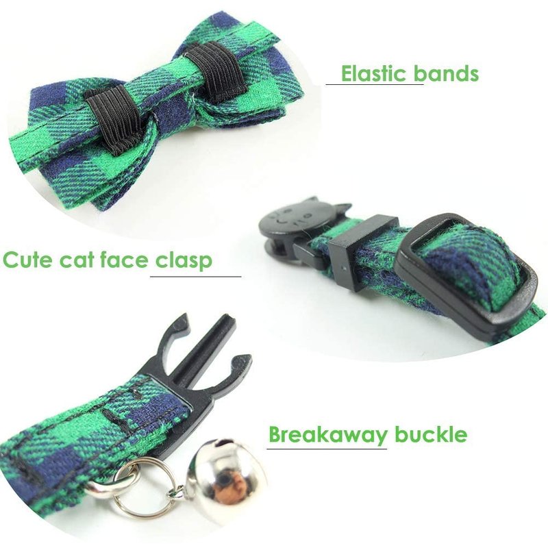 Cat Collar Breakaway with Bell and Bow Tie, Plaid Design Adjustable Safety Kitty Kitten Collars(6.8-10.8in) (Green Plaid)