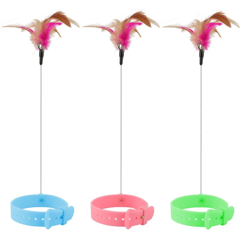 Cat Collar Toy, 3 Pcs Cat Feather Toy with Neck Collar, Interactive Self Playing Toys with Bell for Indoor Kittens Small Animals(Pink/Blue/Green)