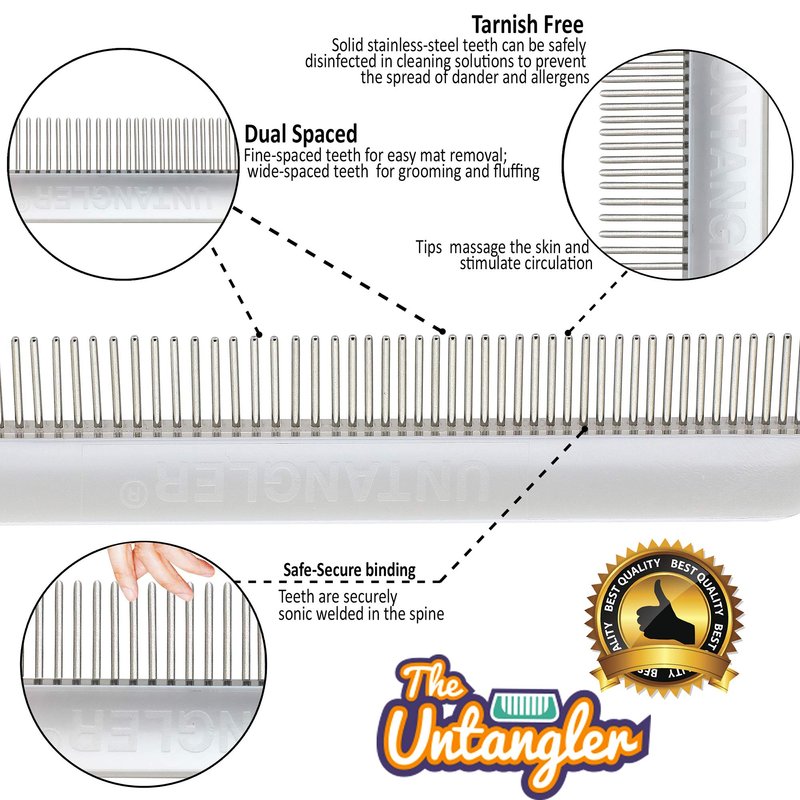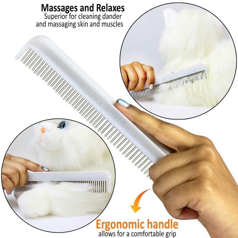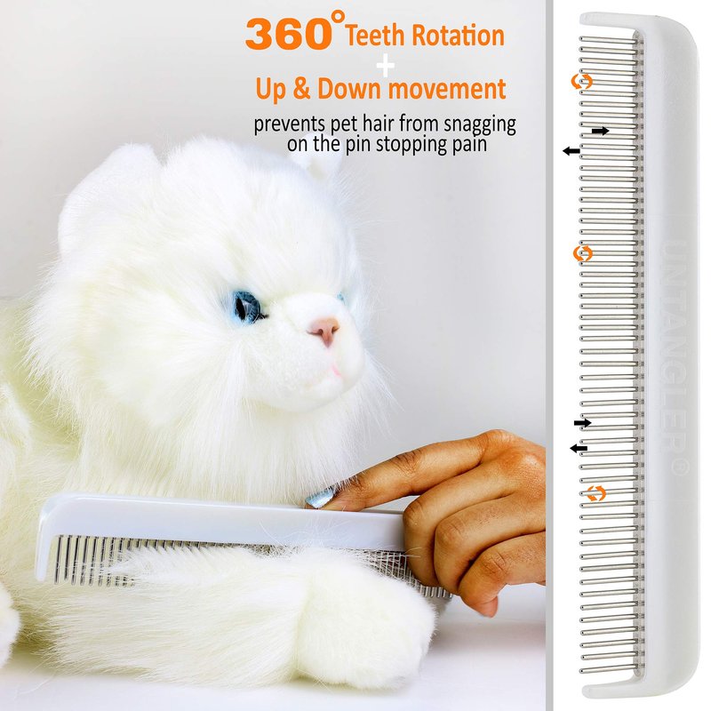 - Untangler Cat combs with fine spaced rotating teeth effectively untangle matted cat hair without less pulling and pain. Each pin on the comb is designed to rotate independently, providing a gentle, fluid motion that detangles hair without painful pulling on the undercoat giving your feline exceptional comfort during grooming.