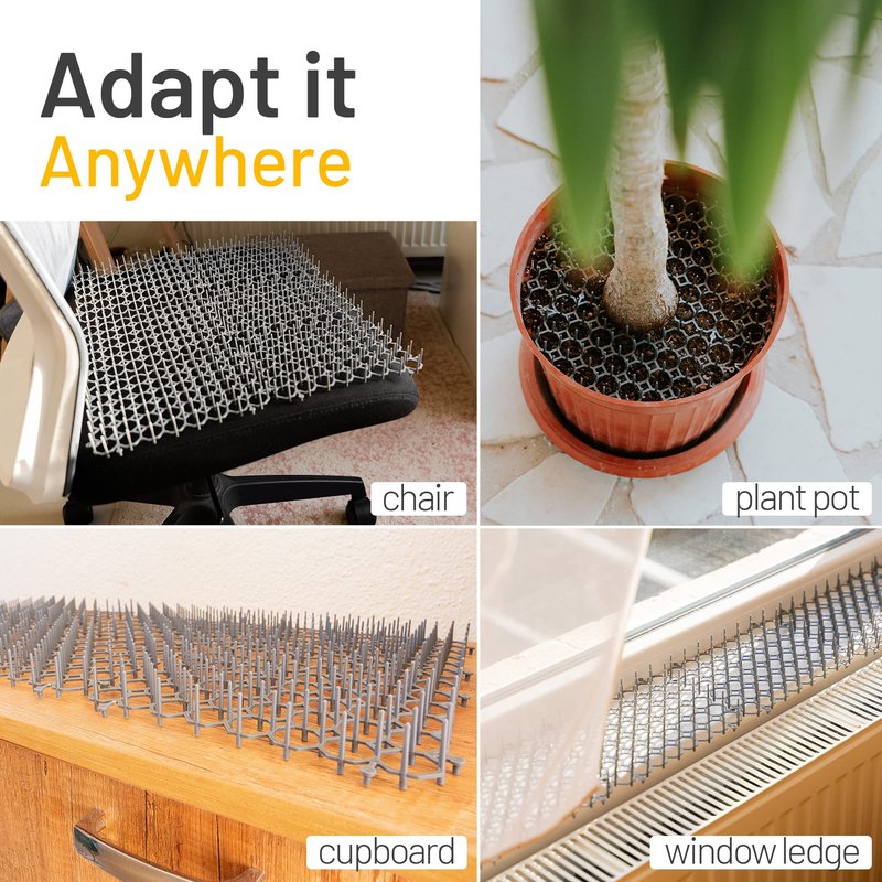 This is a humane and effective solution to keep pets away without hurting them. The spikes deter but not hurt them, successfully protecting your sofa from scratches, blooming plants, paw prints on car windscreen and even helps as a form of cat pee deterrent.