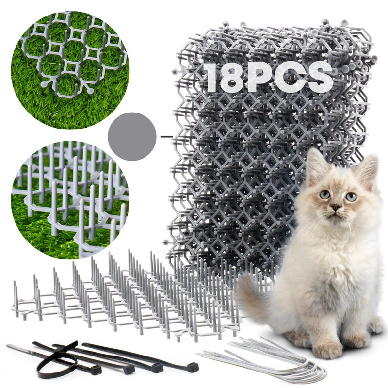 Cat Deterrent Scat Mat for Cats - 18 Pack Cat Spike Mat (Grey) 8 x 6 Inch with 1 Inch Spikes is A Perfect Cat Repellent Indoor & Outdoor for All Seasons. Includes 6 Garden Staples & 10 Zip Ties