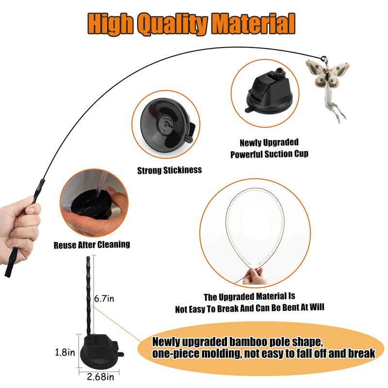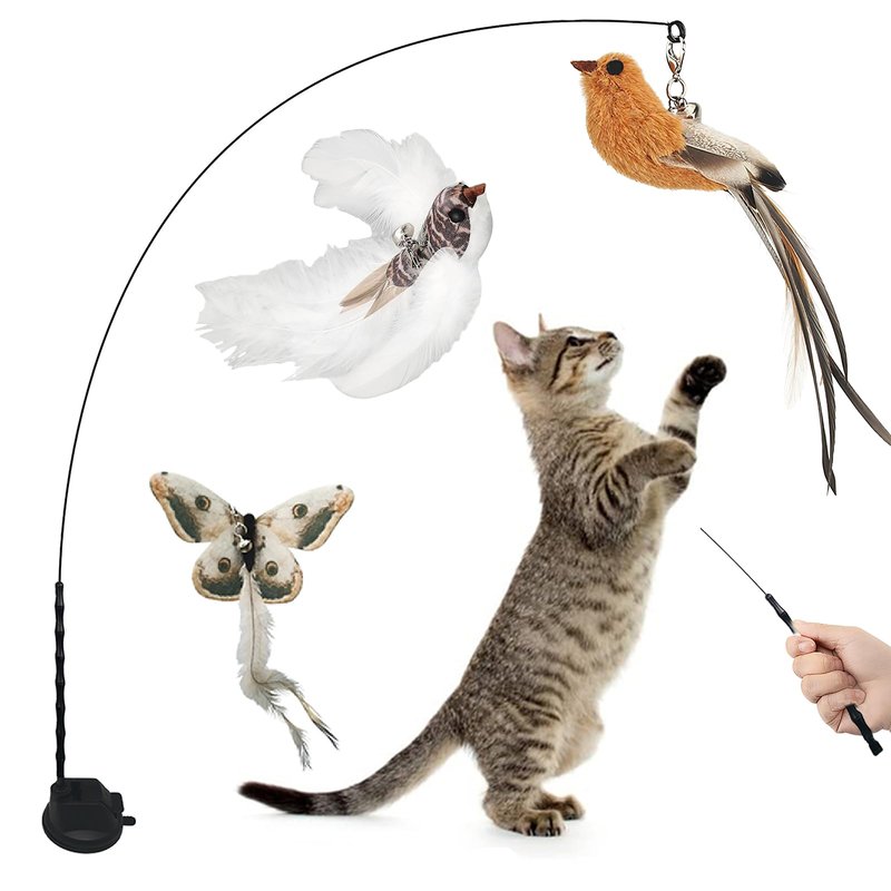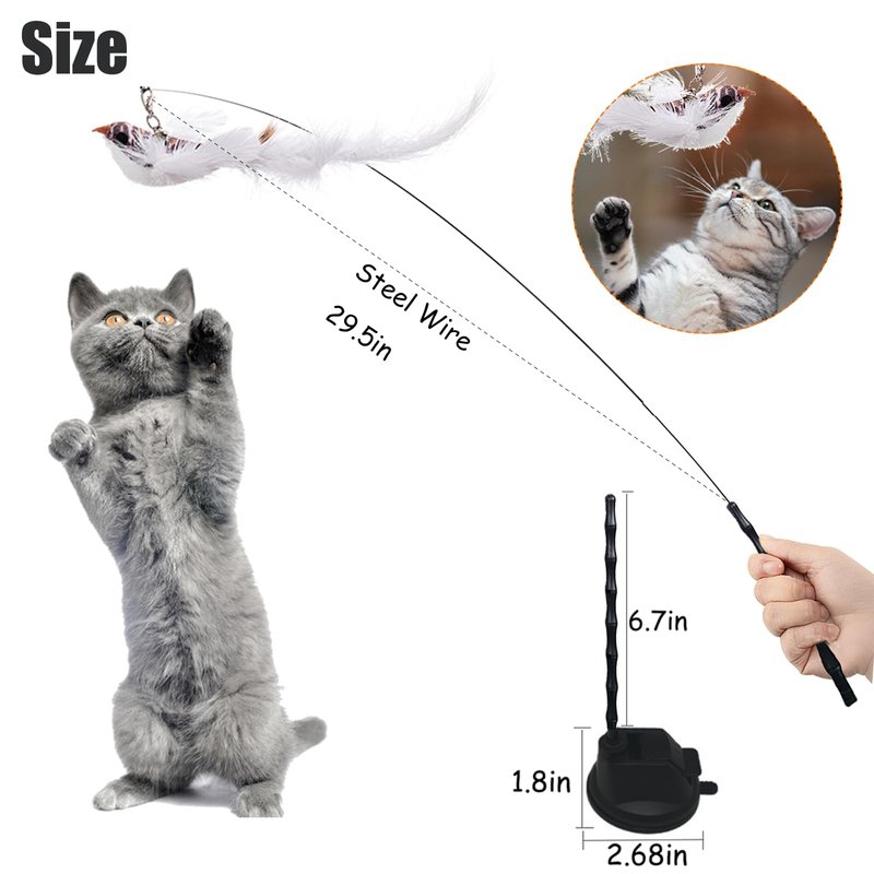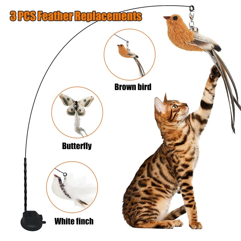 - 【Package Including】Cat toy Including 1 Upgrade suction cup, 1 Cat wand, 3 Replacements toys with bell (1 Brown bird, 1 White finch, 1 Butterfly)