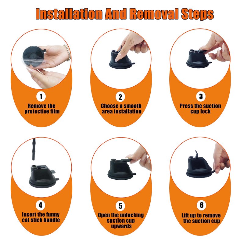 - 【Suction Cup Installation Steps】1: Remove the protective film of the suction cup base, 2:Open the suction cup lock upwards 3: Choose a smooth and clean area to stick the suction cup to it, 4: Press the suction cup lock to install the suction cup. It can not only be adsorbed on glass, but also on smooth tile surfaces, metal paint surfaces, and stainless steel surfaces. Your cat can play freely!