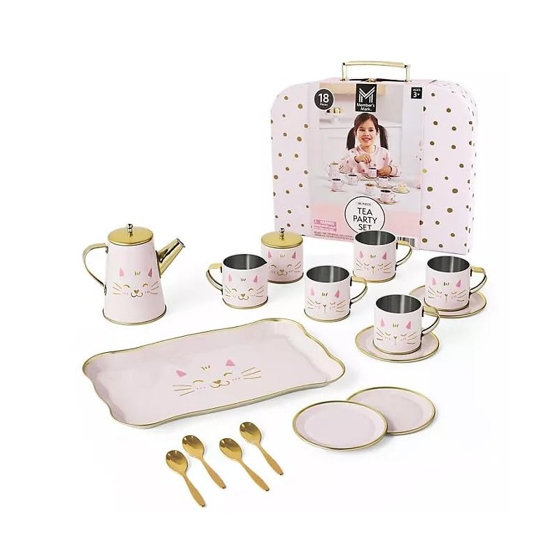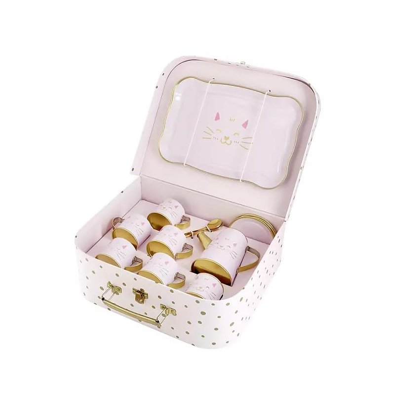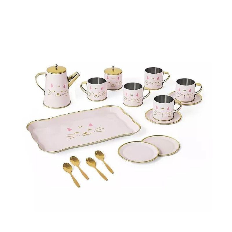 18-piece Tin Tea set with cute cat face Teapot with lid, 4 cups, 4 plates, 4 spoons, 1 tray and more L 11.5" x W 4.1" x H 9.6"
