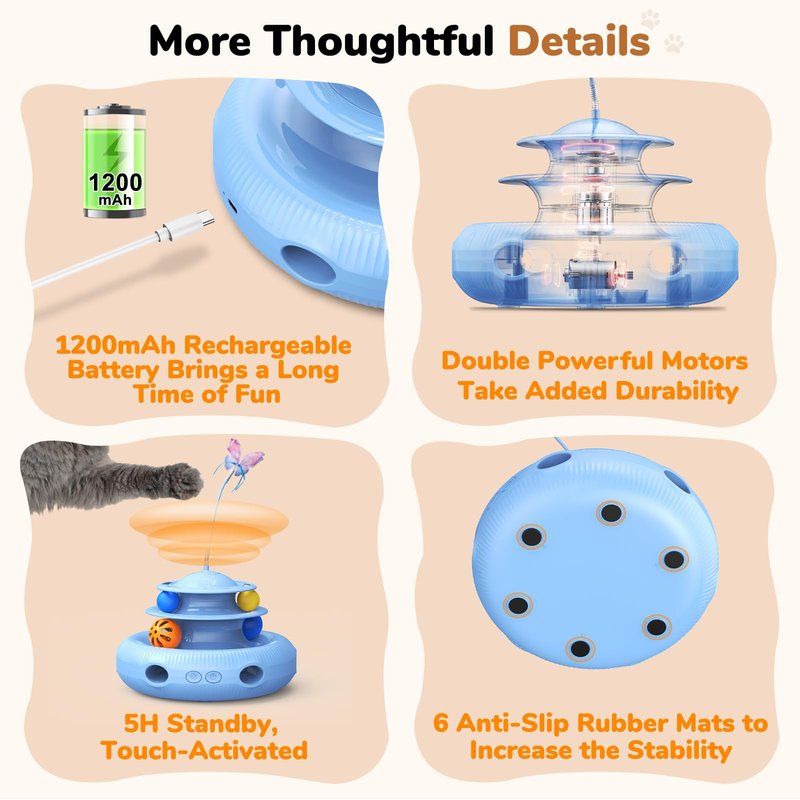 Cat Toys, 4-in-1 Rechargeable Automatic Interactive Cat Toy with Fluttering Butterfly, Random Moving Ambush Feather, Two-Tier Track Balls, 5H Smart Standby, Touch-Activated