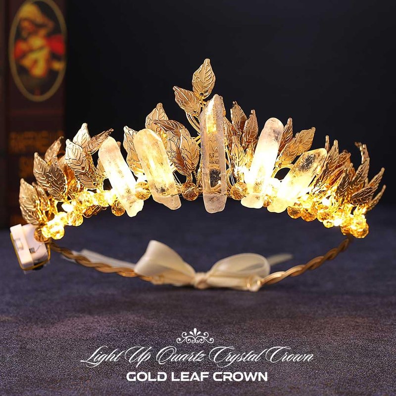 Catery Gold Leaf Headband Raw Crystal Quartz Headbands Light up Crown Headbands Gold Goddess Headpiece Bridal Headdress Festival Wedding Bride Hair Accessories for Women and Girls