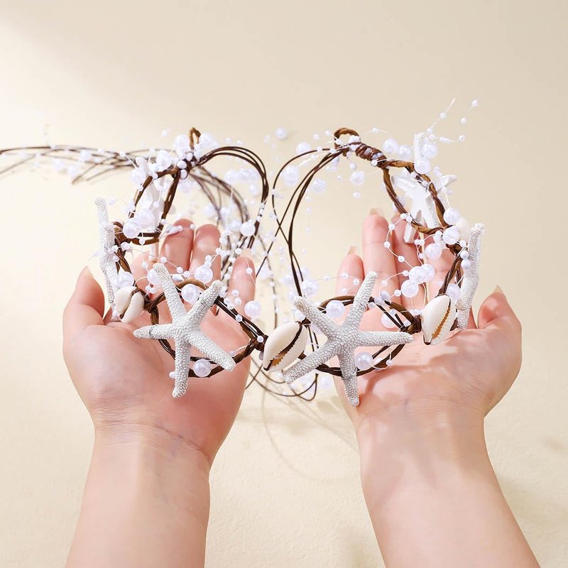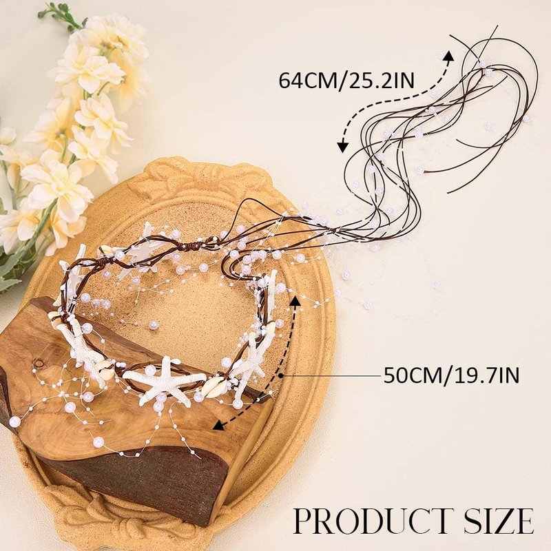 - Boho Starfish headband has a unique design, with a starfish set with a pearl in the center, a small ivory-flower vine and a string of woven pearls.