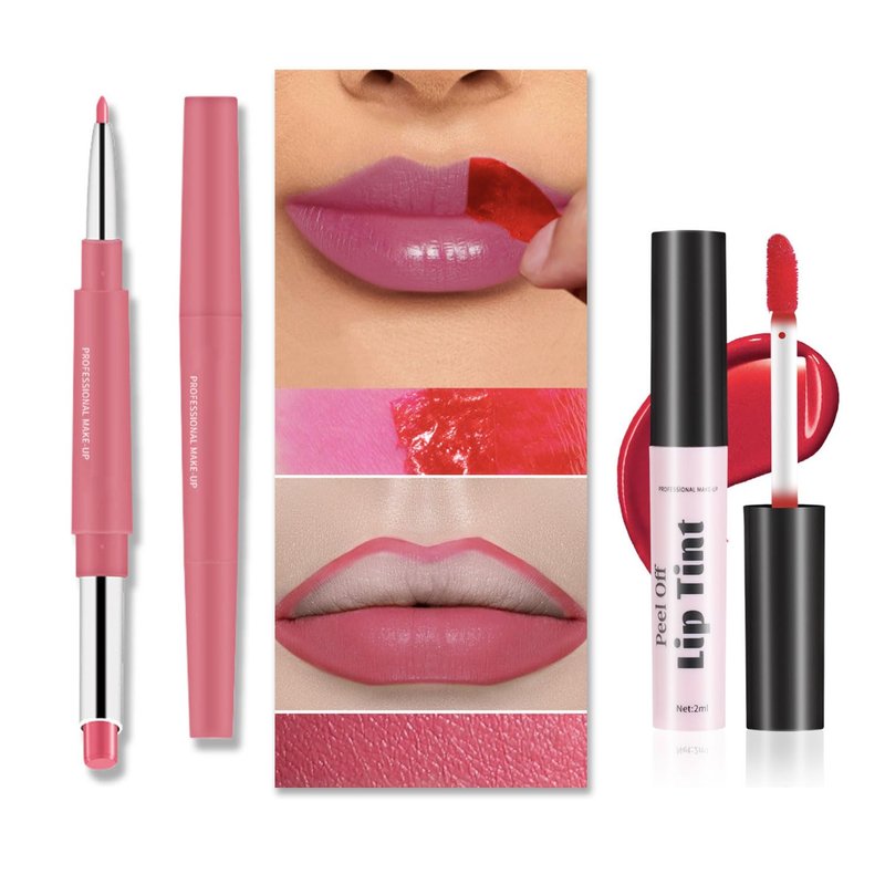 This is a peel-off lip liner stain set that includes a matte liquid lipstick tattoo tint, a long-lasting waterproof lip gloss, and a touch-up pen. The set is perfect for those who want to achieve a bold and long-lasting lip look.