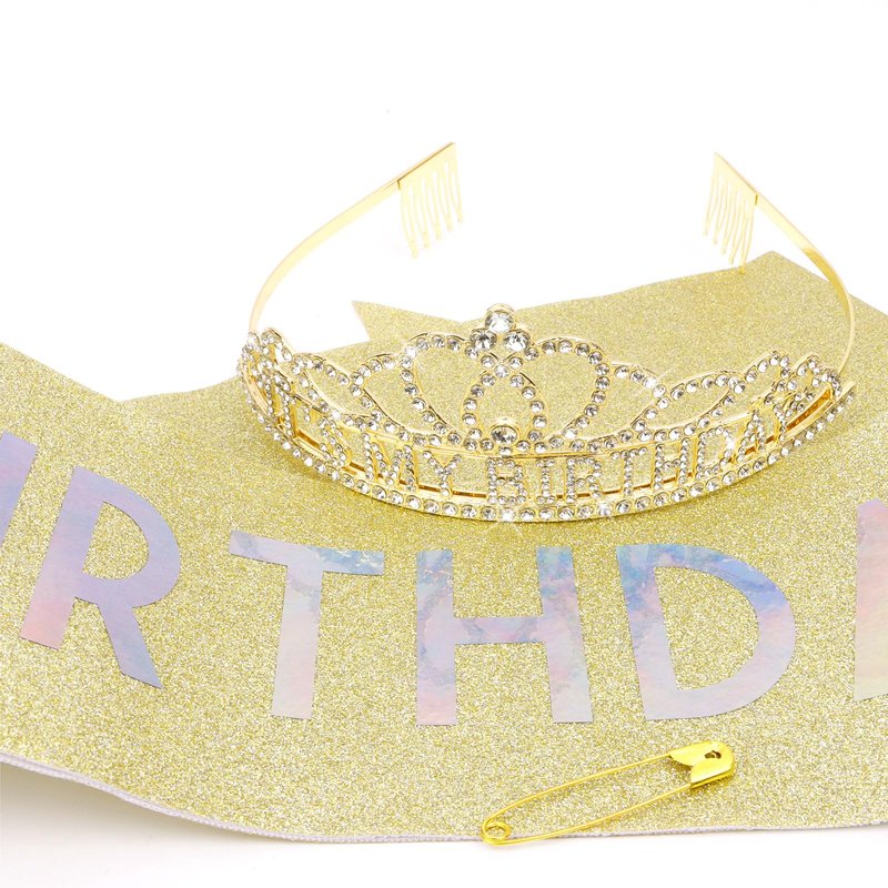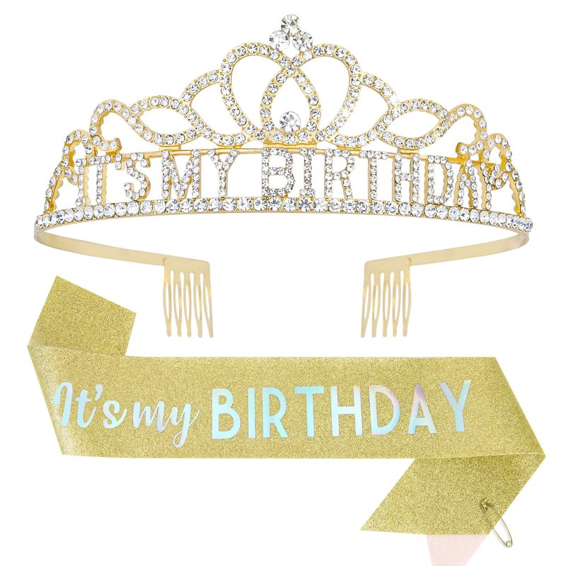 - Gold Rhinestone Tiara + Glitter "It's my BIRTHDAY" Sash Gifts Set.