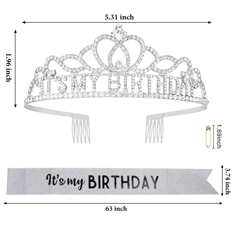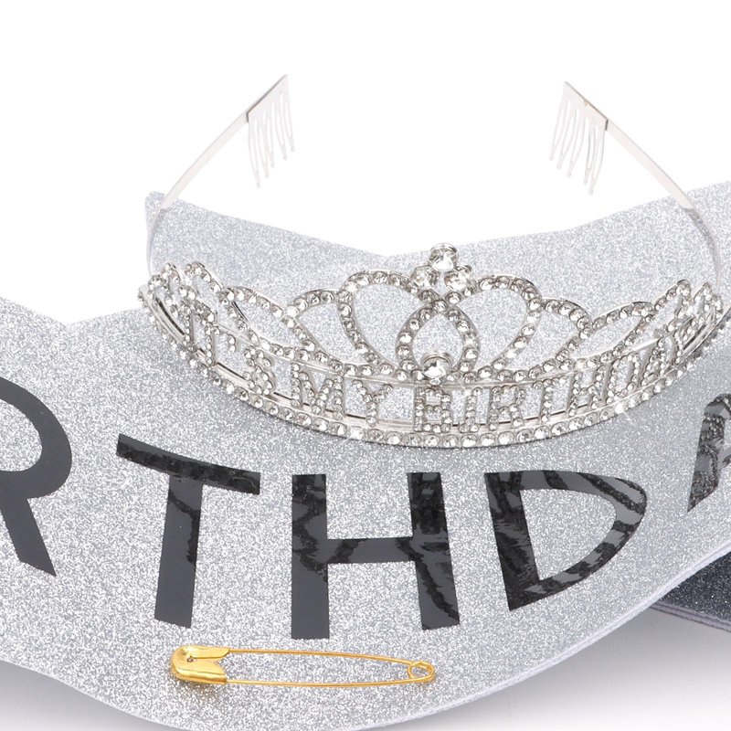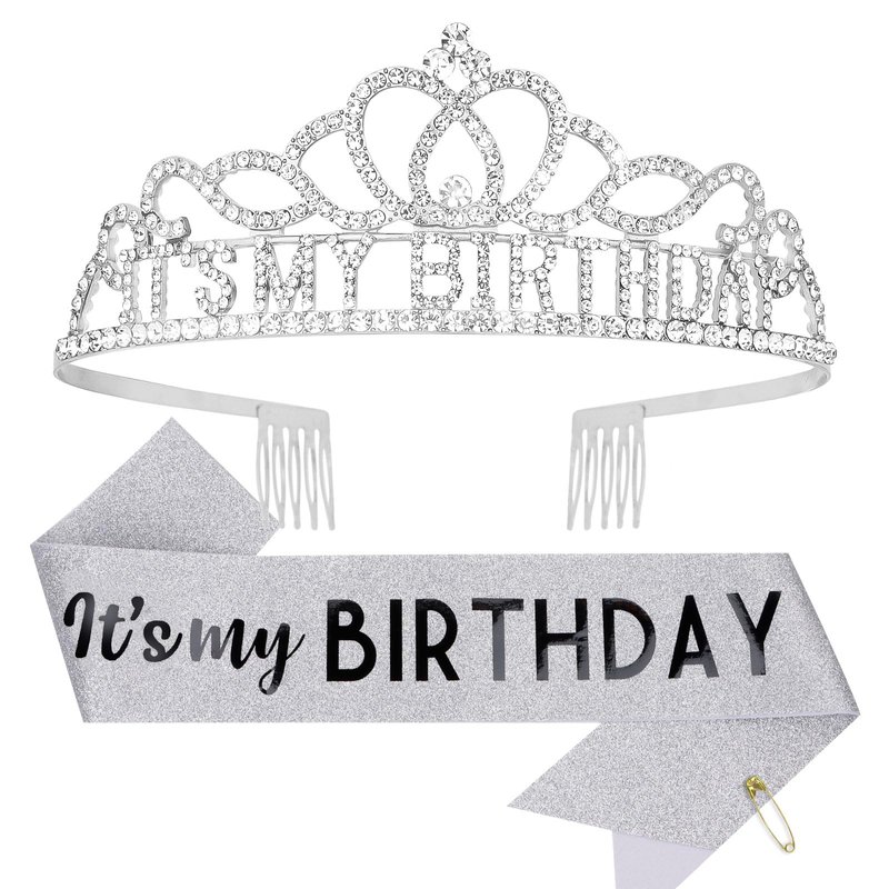 - Silver Rhinestone Tiara + Glitter "It's my BIRTHDAY" Sash Gifts Set.