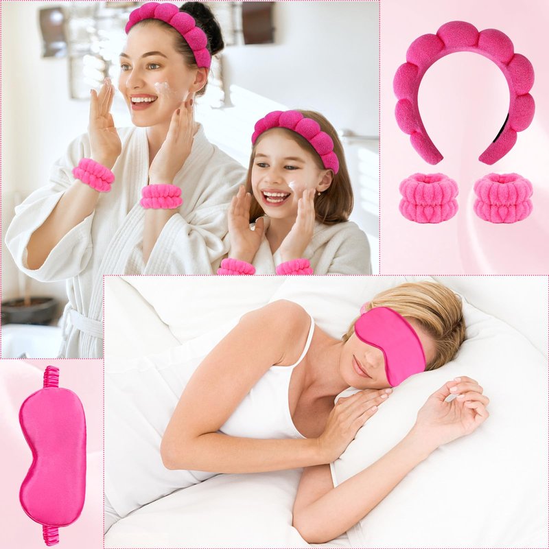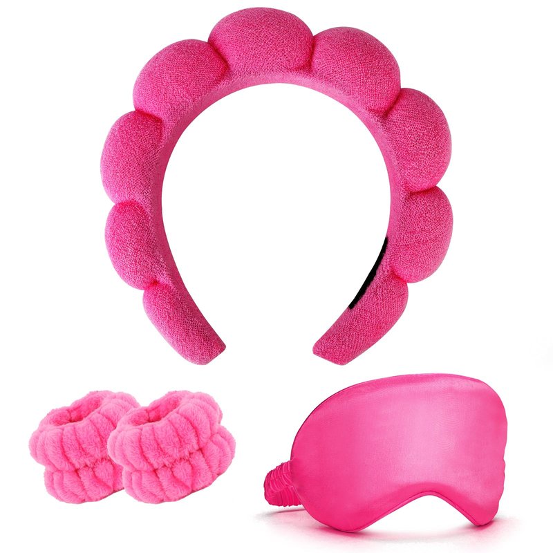 CAVETEE Spa Headband with Sleep Eye Mask Set, Spa Party Decorations Bubble Headband Thick Sponge Headband with Strong Water Absorption for Makeup Removal Skincare Shower (Hot Pink)