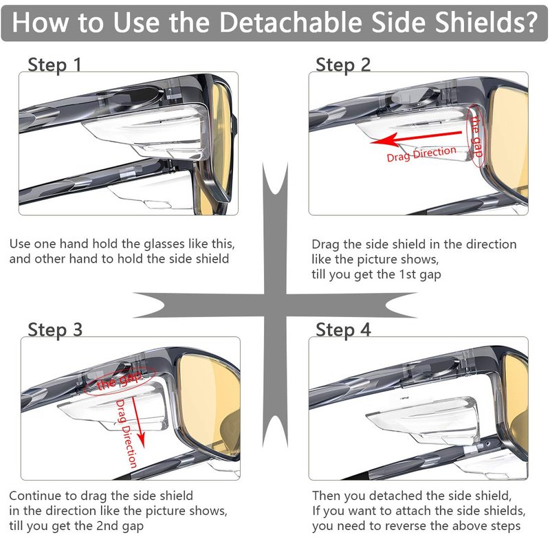 Special designed detachable side shields make you won¡¯t be annoyed by the side glares or side wind any longer. If you don¡¯t need the side shields, just remove these from the frames. It¡¯s convenient!