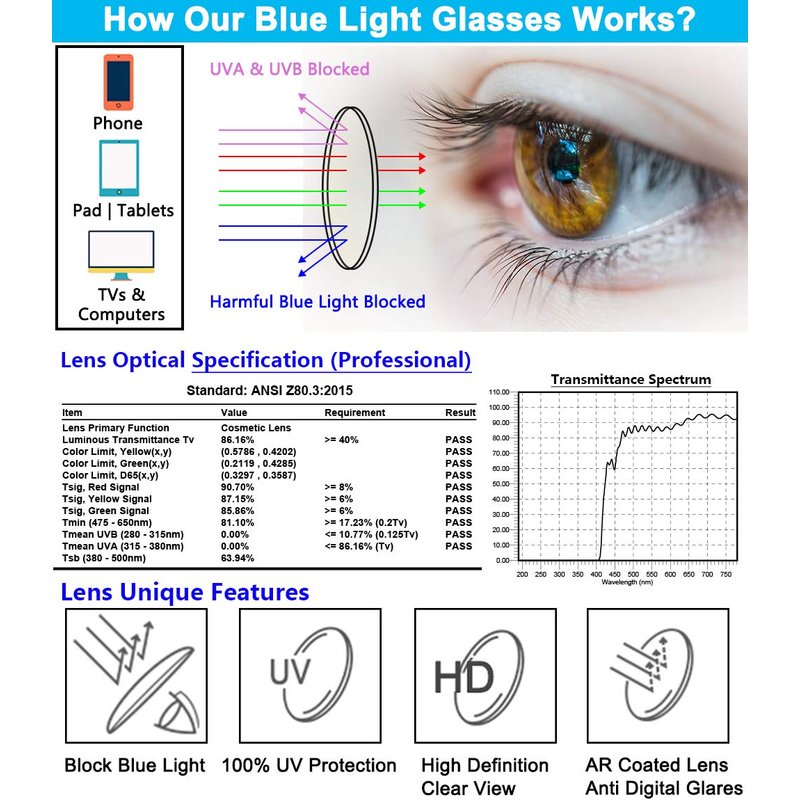 - Anti-Blue Light & 100% UV Protection - block blue light, prevent the damage like macular degeneration, cataracts, and the reduction of melatonin production; UV400 provides 100% UVA & UVB protection