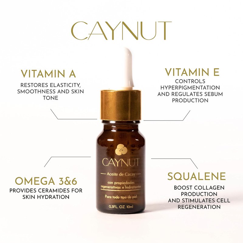 - Cacay is famous for its benefits to the skin through the stimulation of cell regeneration: 1. Anti-aging: due to Squalene and Retinol, which makes it suitable for use around the eyes. 2. Lighten blemishes: due to Tocopherols which are potent antioxidants 3. Deep nourishing and moisturizing: due to Linoleic Acid or Vitamin F. 4. Improve the healing process