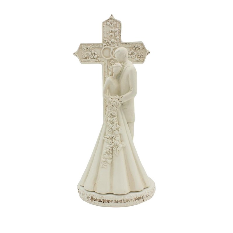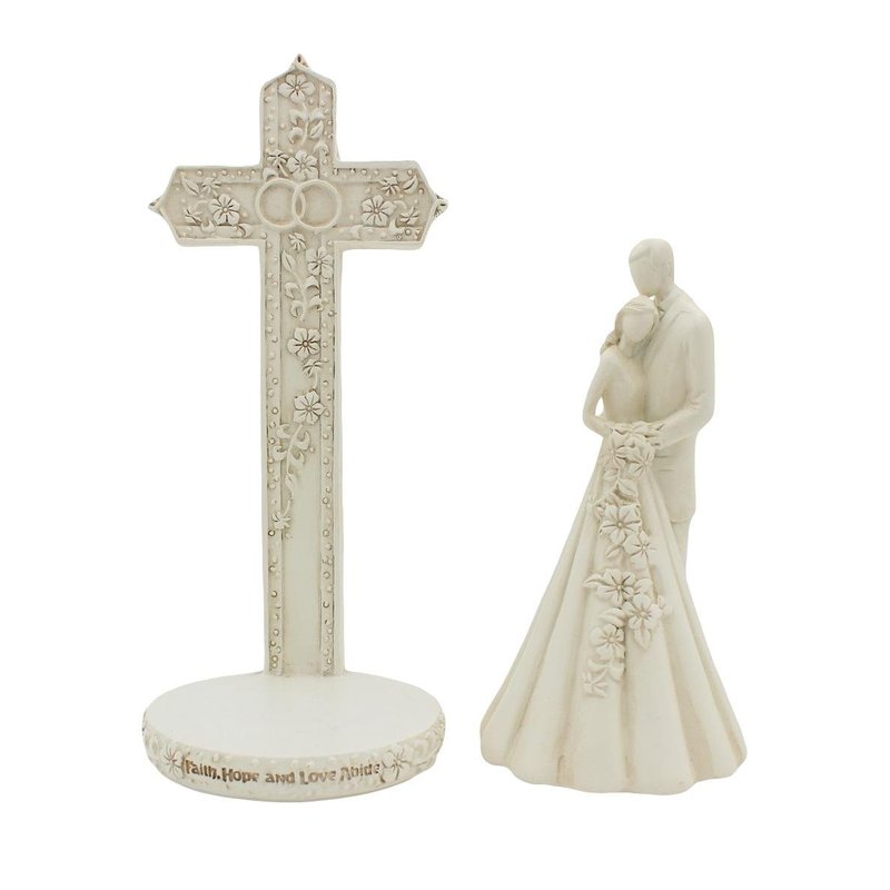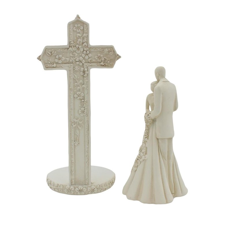 6.9-inch Couple with Cross and Wedding Rings 2-Piece Wedding Cake Topper Set. Off White/Ivory Color. Material: Resin.