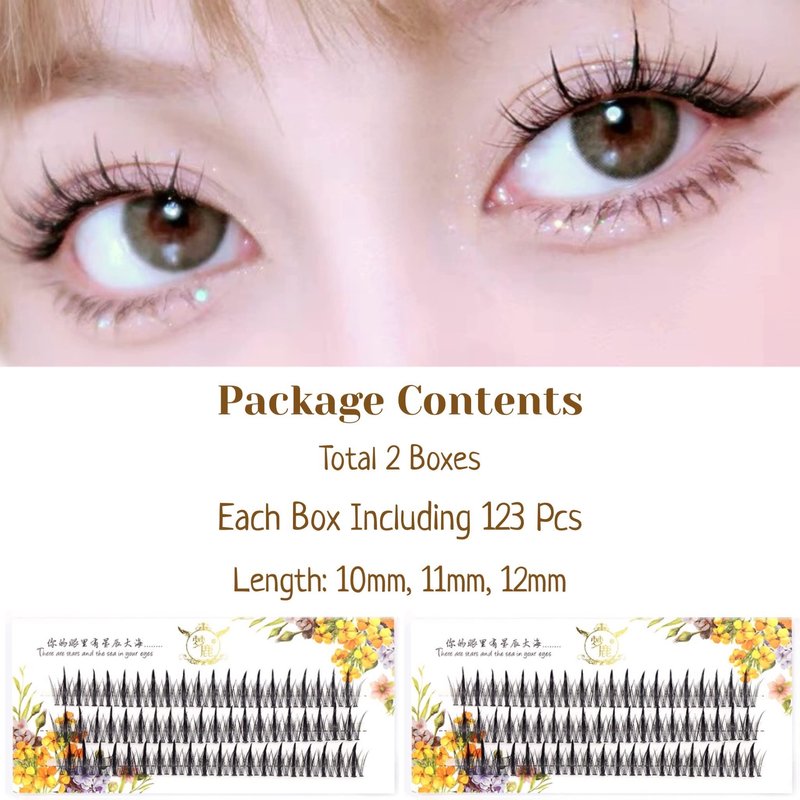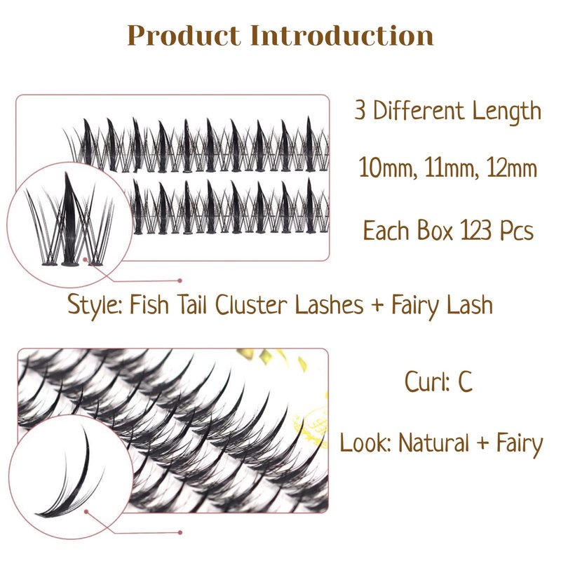 - Style: Fishtail & Fairy Sandwich Design, Natural Doll Look Cluster Eyelashes, C Curl, Length: Mixed 10mm, 11mm, 12mm.