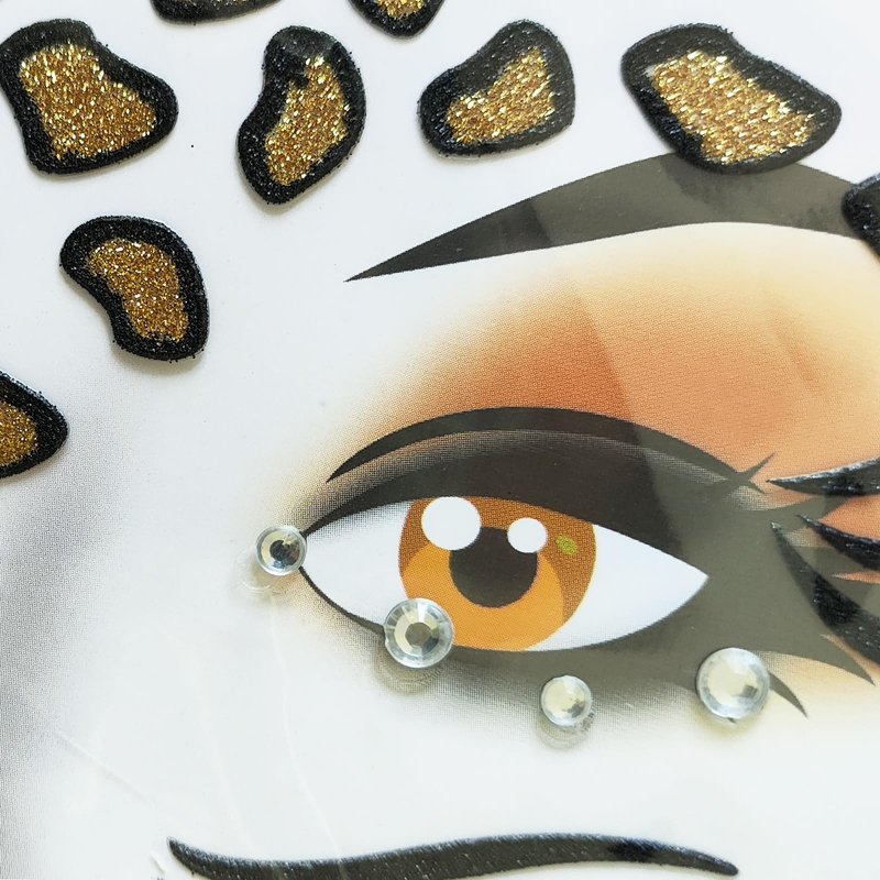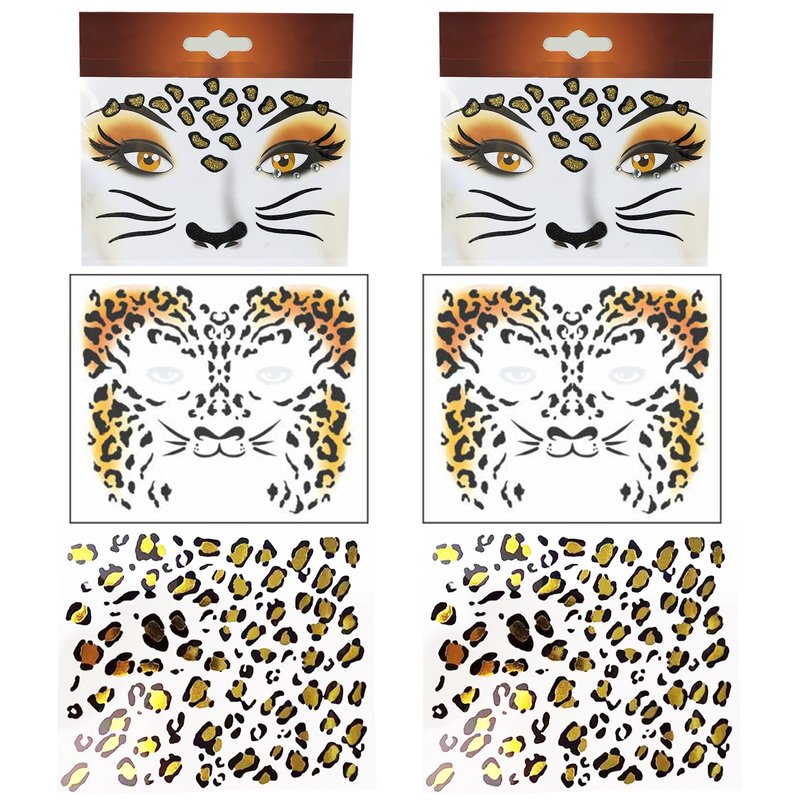 - HALLOWEEN FACE TATTOOS: You will get 6 pcs halloween face temporary tattoos with different styles and colors, beautiful leopard and cat design with glitter gems. The graphics and patterns can be freely changed by your creativity, finally press them gently to fit your face