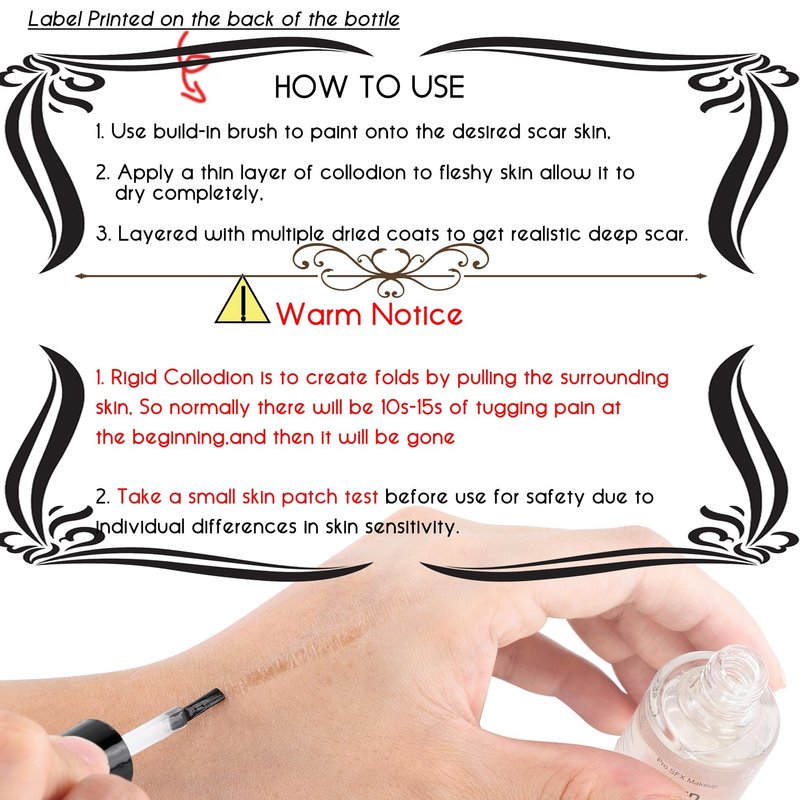 CLEAR SCARRING LIQUID EASY TO PUCKER SKIN - Large 0.5oz (15 ml) Rigid Collodion with a brush applicator helps easy to apply a thin line to "fleshy" areas of skin first, and then increase layer for deeper scarring until reach your desired scar looks. Allow to dry between each layer. Can be used on face and body. Simply take off with SFX Makeup Remover.