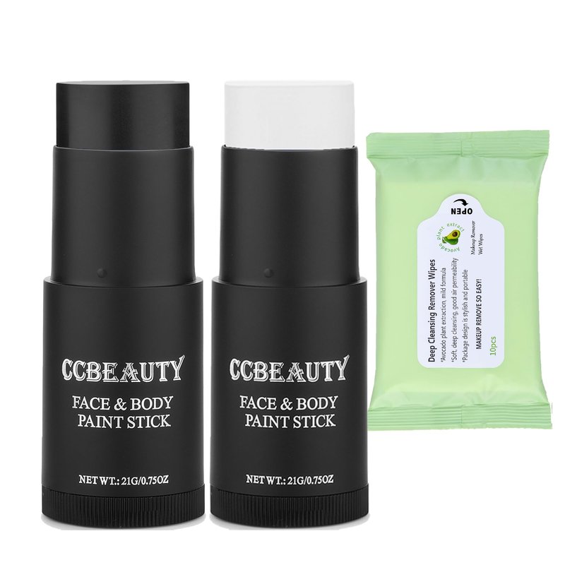 CCBeauty Halloween White Black Face Body Paint Stick + 10 Remover Wipes, Cream Eye Black Stick for Sports, Blendable Foundation for Clown Skeleton Vampire Skull Joker Mime Cosplay Costume Makeup Kit