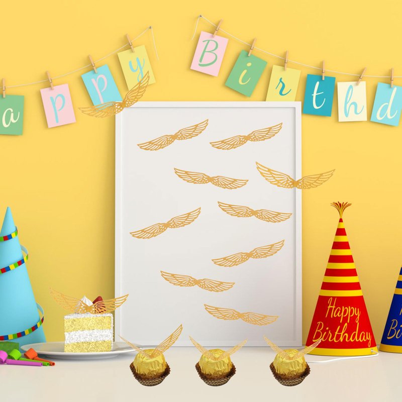 CCINEE 50 Pcs Gold Glitter Wings Wizard Chocolate Decoration Cupcake Toppers Hollowed Golden Wings Wafer with Glue Point Dots for Themed Party Birthday Cake Wedding
