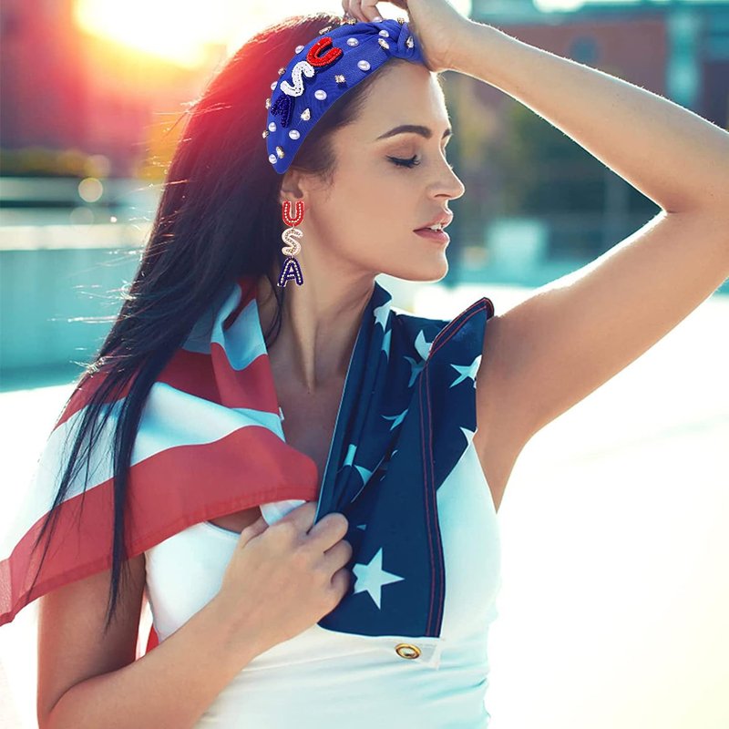- ♥4th of July Headbands -- Celebrate the 4th of July and show off your patriotic pride with our embellished knotted headbands. Features beaded letter ‘USA’ in red, blue and white down the both sides and embellished with shinny rhinestone pearls, adding a little bit of sparkle elements and festive cheer to your 4th of July outfits. The perfect 4th of July accessories to show your patriotism and pride in our great nation