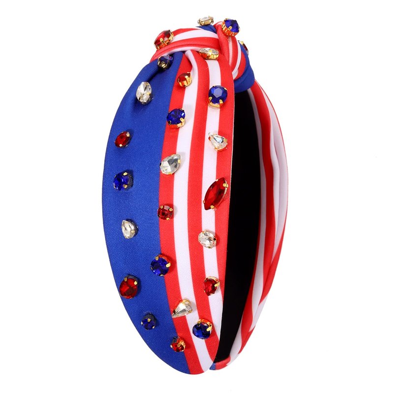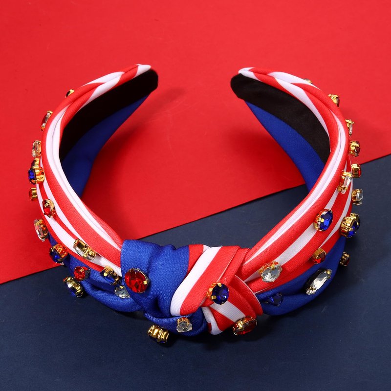- ♥Rhinestone Knotted Headband -- Get ready for the Fourth of July with this jeweled top knot headband. Pair them with your favorite tees, tank tops, shorts, cut-offs, jeans and sundresses for a cute and festive patriotic outfits. Your patriotism is on full display with this red, white and blue American flag hairband. These will look great as we celebrate our great Memorial Day, Flag Day, or Fourth of July!