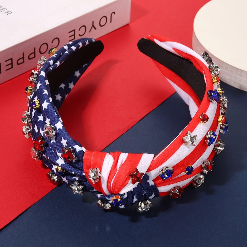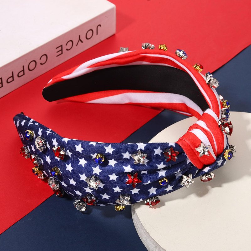 - ♥Rhinestone Knotted Headband -- Get ready for the Fourth of July with this jeweled top knot headband. Pair them with your favorite tees, tank tops, shorts, cut-offs, jeans and sundresses for a cute and festive patriotic outfits. Your patriotism is on full display with this red, white and blue American flag hairband. These will look great as we celebrate our great Memorial Day, Flag Day, or Fourth of July!