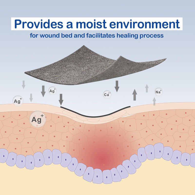 - 【Containing Silver】The silver calcium alginate wound dressing is a non-woven pad composed of calcium alginate and silver particles. The effect of silver can prevent wounds from becoming infected. When the silver alginate dressing is applied to the wound, it absorbs the exudate and releases the silver, effectively protecting the wound.