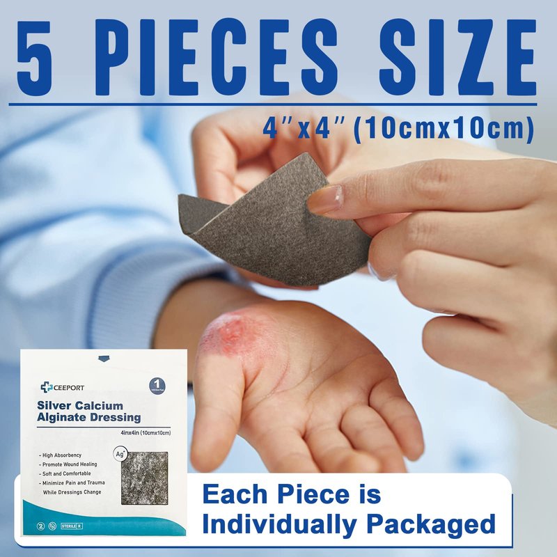 Ceeport Silver Calcium Alginate Wound Dressing, 4" x 4" Patches, Highly Absorbent Dressing Gauze, Non Stick Pads for Wounds, Soft and Comfortable Silver Dressing for Wound Care, 5 Packs