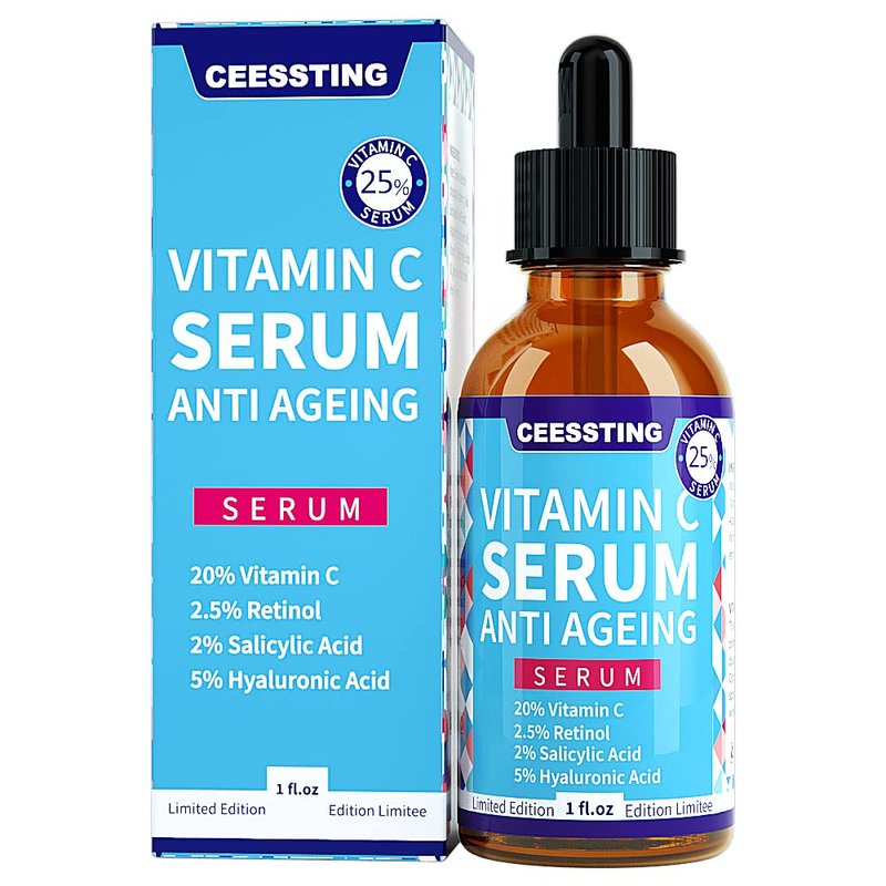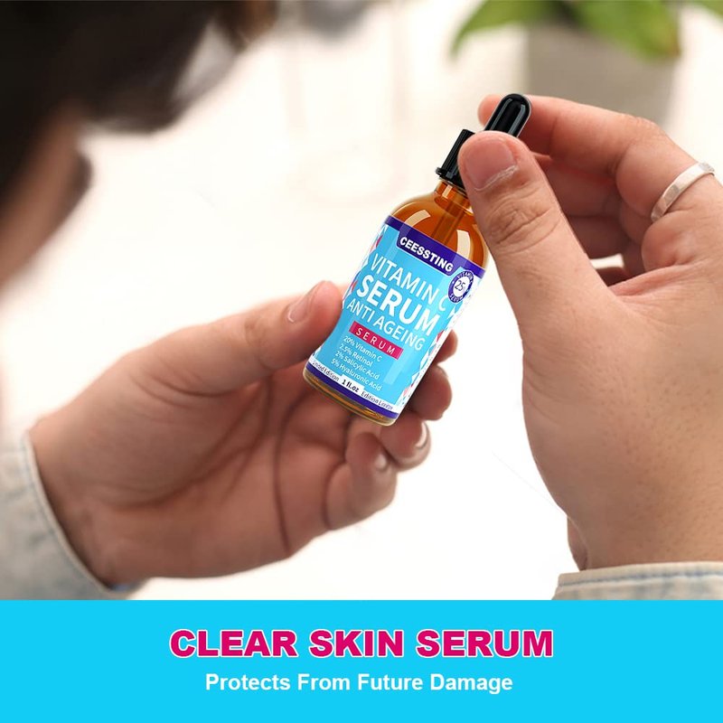 Ceessting Vitamin C Serum for Face - Anti-Aging Facial Serum with Hyaluronic Acid and Vitamin E - Improves Skin Texture, Glow and Elasticity - Reduces Wrinkles, Fine Lines and Dark Spots - 1 oz