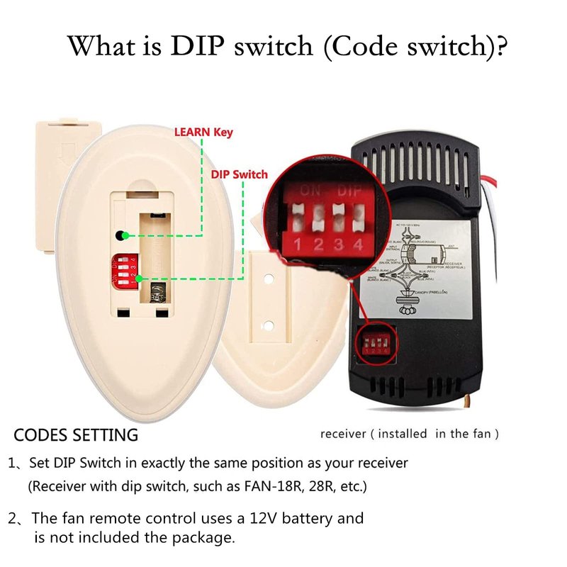 - Package Includes: 1x Ceiling fan remote control and receiver, 1x user manual,2x Screw, 6x Wiring Cap. Note: 12V battery is not included.