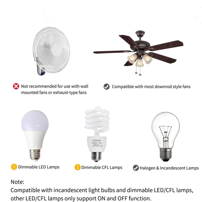 This FAN-35T ceiling fan remote control is a great replacement for Hunter,Hampton Bay,Allen+Roth, Kichler ceiling fans. This ceiling fan remote control kit can replace KUJCE9603 CHQ7202T UC7202T CHQ7202T1 UC7020T A25-TX007R A25-TX007R1 .This ceiling fan remote control kit have a durable and powerful black receiver.This ceiling fan receiver uses 2 upgraded relays, with the new component the dimming function of the relay is better than the thyristor.The rated power of the receiver is 240W, which far beyond the general carrying power capacity, it allows you to access more light bulbs. 3-Speed (High/Medium/Low) and OFF for ceiling fan. LIGHT/DIMMER: press to switch the light, long press to adjust the light. The light dimmer works well with some dimmable CFL/LED lights and all incandescent lamps. Most LED/CFL lights are non-dimmable, the remote only control ON/OFF function and it may cause to flicker when using the dimming function. Matching dip switch for the transmitter and receiver: Look inside the old remote with the battery cover off. There is a series of " DIP" switches(4) with a pen, slide the switches in the new remote to match the same pattern as the old remote. Replace the battery in the new remote and things should work well.The ceiling fan receiver wires are labelled, and the wires all have the correct color codes. The set even comes with the screws and drywall anchors for mounting the holder to the wall.Remote Control *1, Receiver *1, Wall Mount Holder *1, User Guide *1, Wire Nuts *6, Screws *2. This remote control use a 3V batteries (NOT INCLUDE). OUR SERVICE - 30-day money-back guarantee for any reason; 12-month warranty for quality-related issues. If there are any problems with the purchase, please feel free to contact us, we will help to fix the problem.