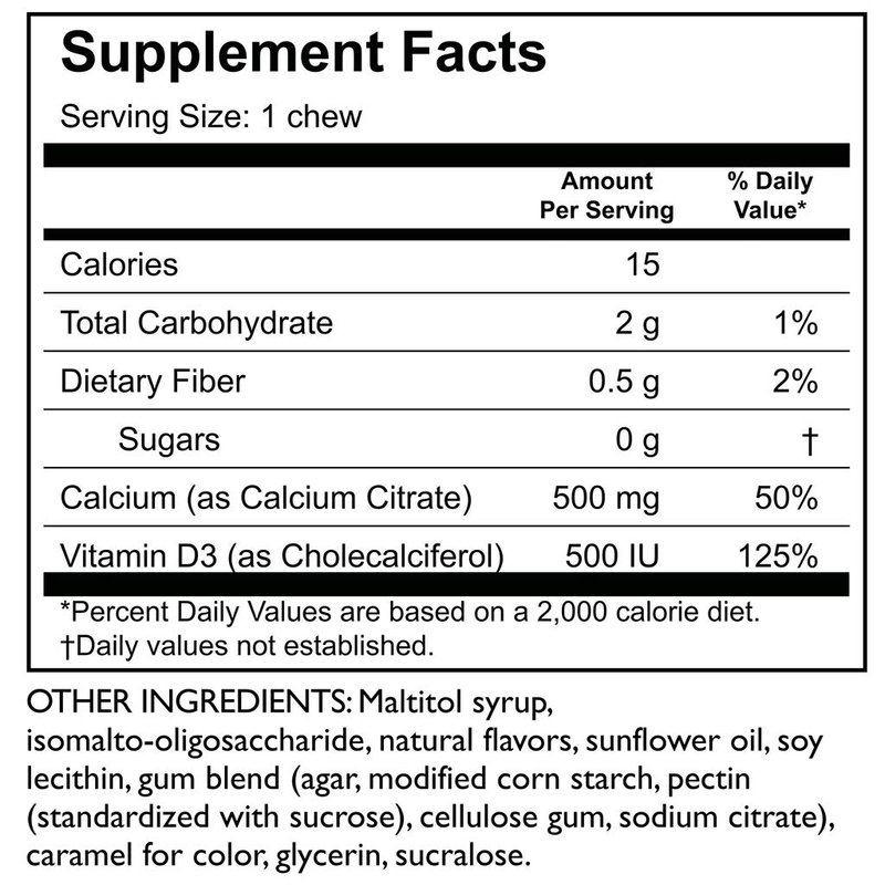 - Vitamin D : These calcium citrate chews are fortified with 500 IU vitamin D3, providing support for maximum absorption of calcium, offering bone density supplements in one tasty chew.
