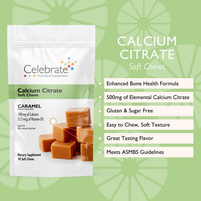 Celebrate Vitamins Calcium Citrate Soft Chews are the ideal choice for premium bone density supplements. Each chew contains 500 mg of calcium citrate and 500 IU of vitamin D3, supporting your overall bone health and bone strength. Our formula is specially designed for maximum absorption, meeting your daily calcium requirements after bariatric surgery, during perimenopause, or any other time you may require calcium supplementation during your busy, active lifestyle. These calcium gummies are not only delicious but they are easy to consume. Their smooth, non-gritty texture won't stick to your teeth and the delightful flavor options will tantalize your taste buds. They are not only a great-tasting alternative to traditional calcium tablets and capsules but also an easy way to increase your daily calcium intake. Our calcium with vitamin d3 is individually wrapped for your convenience and comes in a resealable bag, making them perfect for those on-the-go moments and maintaining freshness and quality. These chews are sugar free and gluten free, suitable for a variety of dietary needs. Formulated for those who have undergone gastric bypass or gastric sleeve procedures, bariatric must haves like these calcium gummies are essential in maintaining optimal health post-surgery. At Celebrate Vitamins, we are committed to supporting your health journey. We proudly manufacture our vitamins and supplements in the USA, in a GMP certified facility, and all of our bariatric vitamins meet ASMBS guidelines. Your bones are the foundation of your health, so reach for Celebrate Vitamins Calcium Citrate Soft Chews during your daily regimen and give yourself the gift of optimal bone health in one deliciously tasty treat!