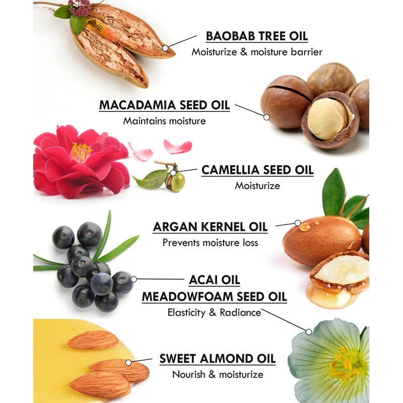 - ✅ 7 FACIAL OIL BLENDS. Infused with baobab tree, macadamia seed, camellia seed, argan kernel, Asian palm fruit, meadowfoam, and sweet almond oils, this face cleansing oil fortifies the skin moisture barrier to enhance its moisture retention ability and provides optimal hydration.