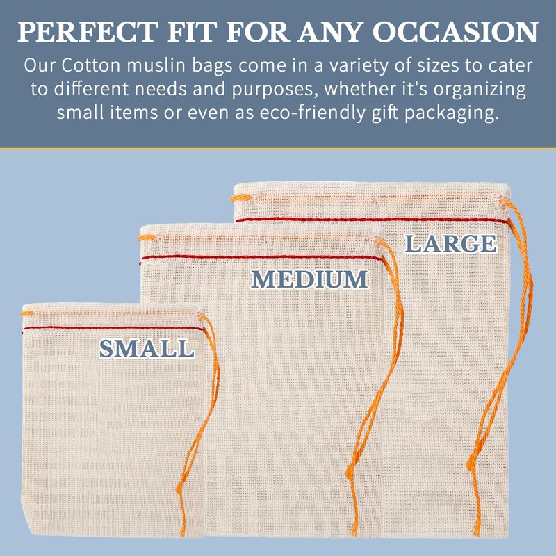 - CONVENIENT AND SECURE: Enjoy the convenience of our Cotton Drawstring Bags, featuring a secure drawstring closure for easy access. Whether you need a soap bag, produce bag, or a small drawstring bag, these versatile muslin bags keep your items safe and clean. Experience practicality and functionality wherever you go with our reusable cotton muslin bags.