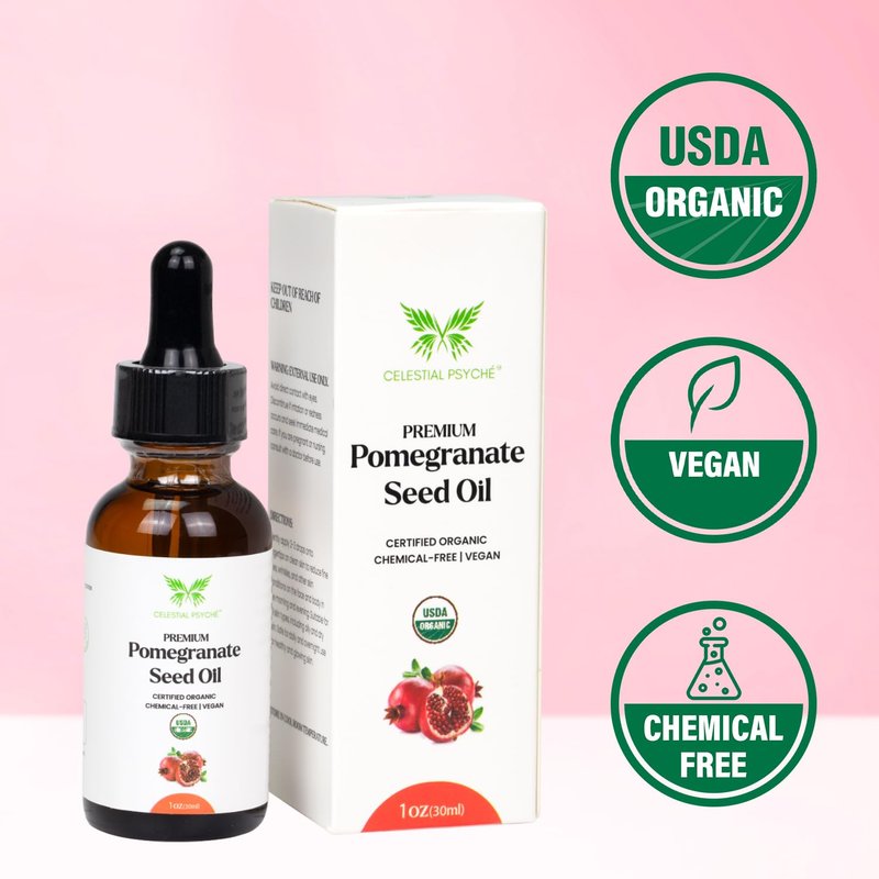 Celestial Psyché USDA Certified Organic Pomegranate Seed Oil (1 Oz) 100% Pure Natural, Hexane-Free, Face Moisturizer, Skin Hydration, Nails Natural Beauty Enhancement, Anti-Aging, Scar Relief