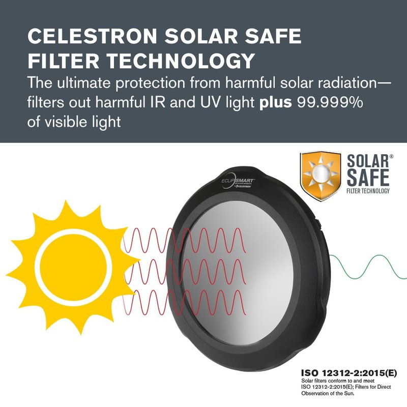 - SOLAR SAFE TELESCOPE FILTER: Filter conforms to the ISO 12312-2:2015(E) international safety standard for filters directly viewing the Sun. The ideal tool for viewing eclipses, sunspots, or the Sun any day!