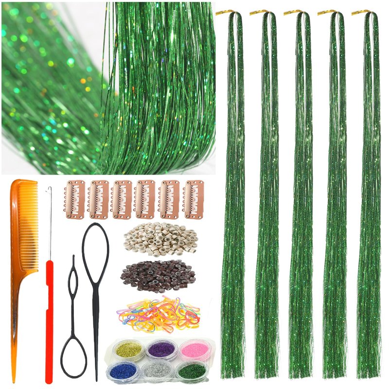 CelineBella Hair Tinsel Green Fairy Hair Extensions Kit Sparkling Shiny Highlights Glitter Tinsel Hair Extensions for Women Girls Children(48 Inch Pack of 5Pcs, Shining Green)