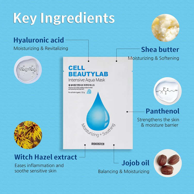 CELL BEAUTYLAB Intensive Aqua Mask 10 Pack | Hydrating, Moisturizing and Soothing Face Sheet Mask for All Skin Types | With Hyaluronic Acid, Panthenol, Shea Butter, Jojob Oil, Witch Hazel